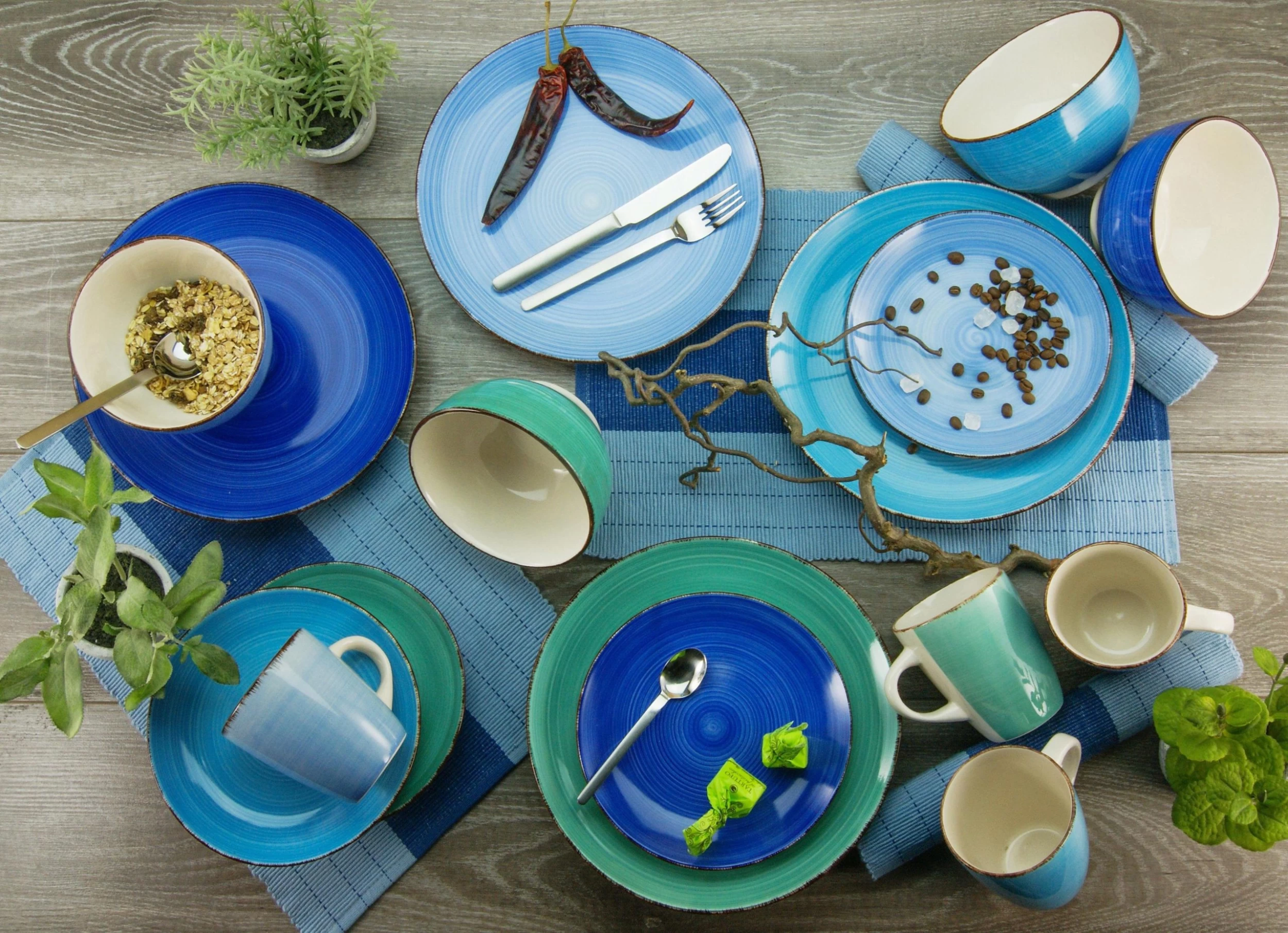CreaTable Combi-servies Bella Casa Aqua Met De Hand Geschilderde Spiraaldecoratie (set)