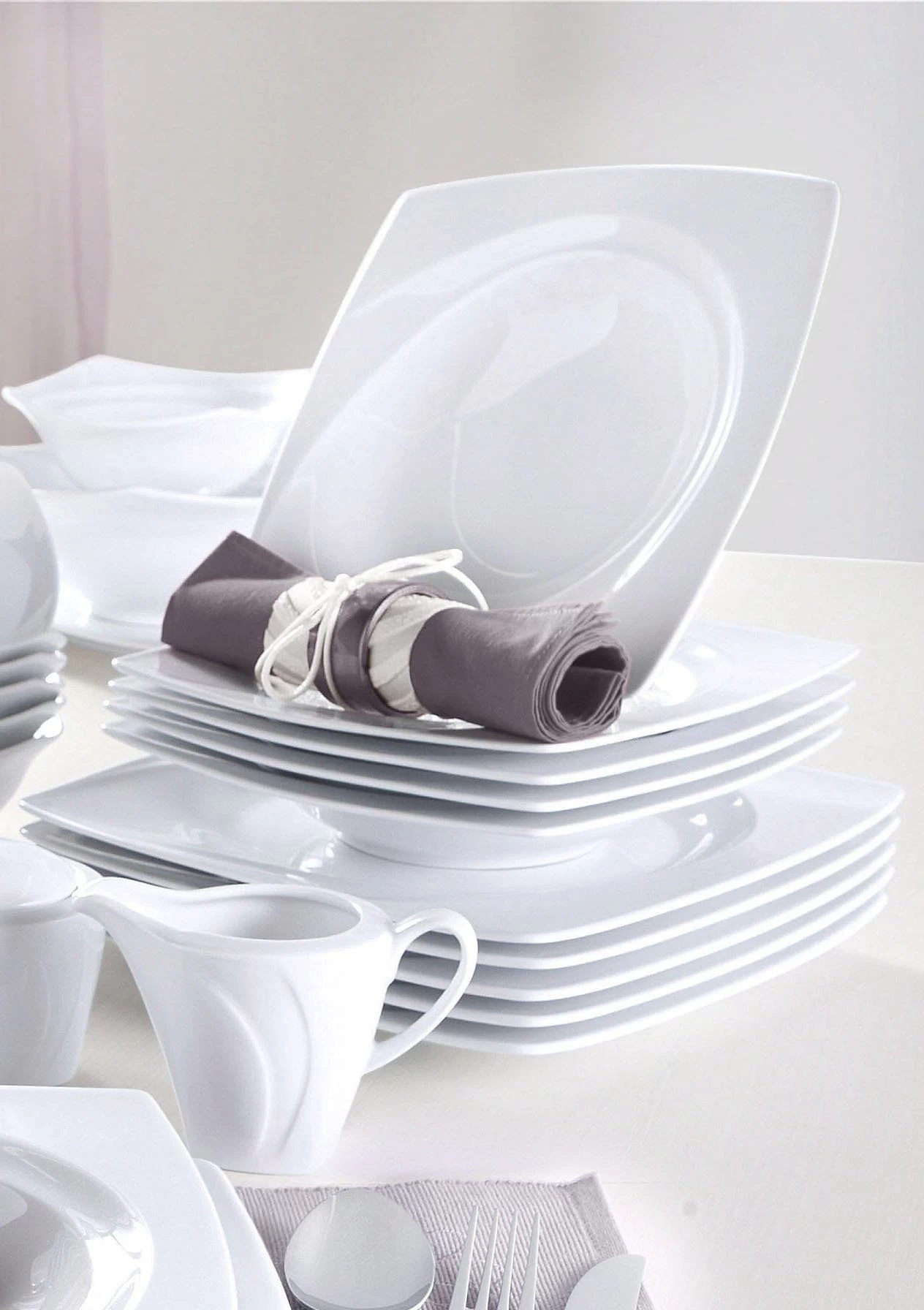 Het moderne servies »Celebration« in wit verandert elke tafel in een elegant gedekte eettafel. Het stijlvolle serviesgoed in vierkant model met mooi reliëf plaatst een harmonieus accent aan iedere tafel. Past dankzij de witte kleurstelling moeiteloos bij iedere woonsfeer en is prachtig met andere kleuren te combineren. Alle delen zijn vaatwasserbestendig en geschikt voor de magnetron. Elegante serie »Celebration«: bijzonder leuk porselein in een buitengewoon design.
