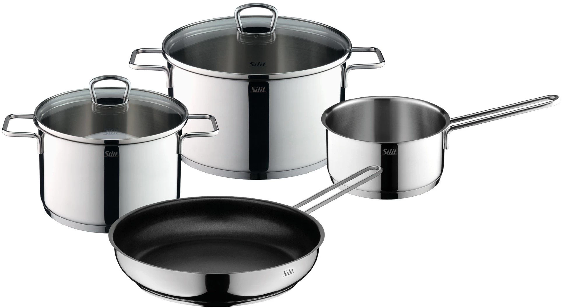 Pannenset »Collection« van ELO. Edelstaal, inductie. <br>ELO-pannenset »Collection« + gratis koekenpan »Ducto«. Pannenset van eersteklas edelstaal 18/10 met ingekapselde sandwichbodem en glazen deksel met stootvaste edelstalen rand. Binnenin gesatineerd, met maatverdeling in liters, aan de buitenkant gesatineerd, met gepolijste rand. Geschikt voor alle warmtebronnen, ook voor inductie. <br><br><b>Meer details: </b><ul> <li>Wanddikte ca. 0,6 mm</li><li>Totale bodemdikte ca. 3,5 mm</li><li>Recht model met schenkrand</li><li>Platte edelstalen beugelgrepen</li><li>Geschikt voor de vaatwasser</li></ul><br><b>De 9-delige pannenset bestaat uit: </b><br><br>1 braadpan met deksel Ø 20 cm <br>1 kookpan met deksel Ø 16 cm <br>1 kookpan met deksel Ø 20 cm <br>1 kookpan met deksel Ø 24 cm <br>1 steelpan Ø 16 cm <br><br>Je krijgt er gratis de ELO-koekenpan »Ducto« bij, Ø 28 cm. Deze is van aluminium, heeft een hoogwaardige dubbele antiaanbaklaag en is aan de buitenkant antracietkleurig gelakt. Geschikt voor alle warmtebronnen, ook voor inductie. <br><br><b>Meer details: </b><ul> <li>Materiaaldikte ca. 2,8 mm</li><li>Steel van zwarte kunststof en aluminium</li><li>Vlambeschermer, geschroefd</li><li>Steelsysteem geseald</li><li>Randen afgerond en gepolijst</li><li>Geschikt voor de vaatwasser</li></ul>