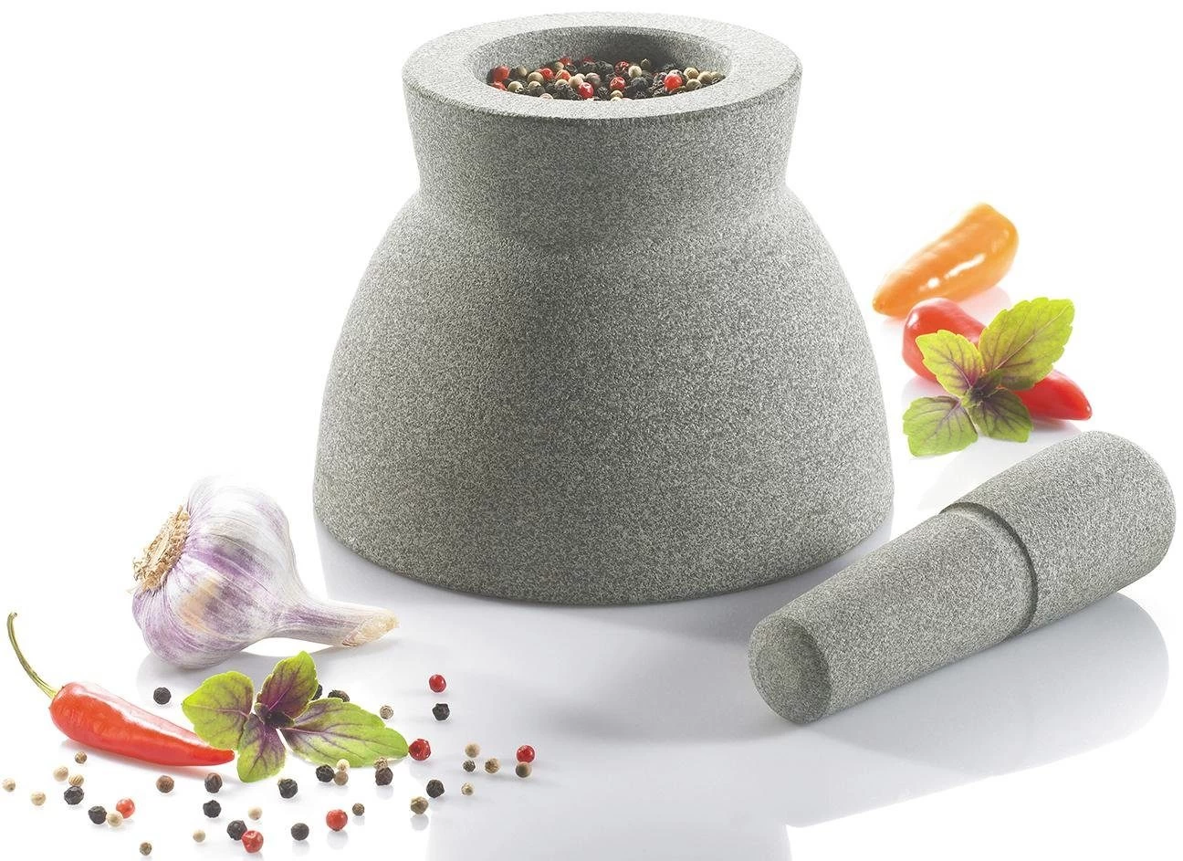 GEFU. Granieten vijzel »CRUNCHY«. Veelzijdig en aan beide kanten te gebruiken voor kleine hoeveelheden specerijen of grotere hoeveelheden pesto. Draai de vijzel om voor een kleinere versie – met precies de juiste proporties voor het stampen van bijv. peperkorrels. Door de ronde bodem krijgen de ingrediënten de perfecte consistentie. Met ergonomische vijzel. Ø 17 cm, hoogte 13 cm; vijzel Ø 4 cm, lengte 14,5 cm.