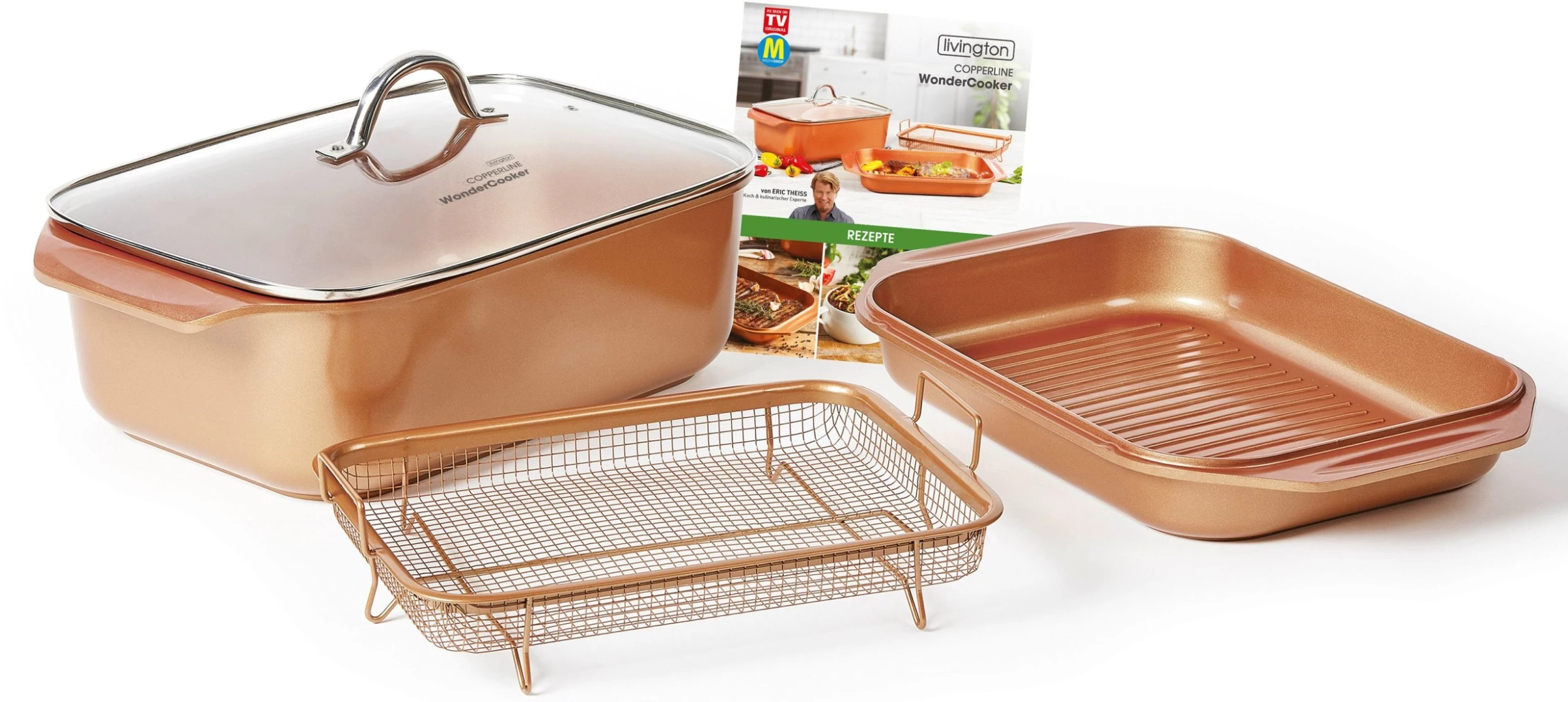 LIVINGTON Braadpan Cooperline Wonder Cooker Inclusief Grillpan, Glazen Deksel, Cooper Crisper, Receptenboek, Inductie (set, 5-delig)