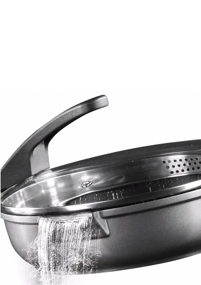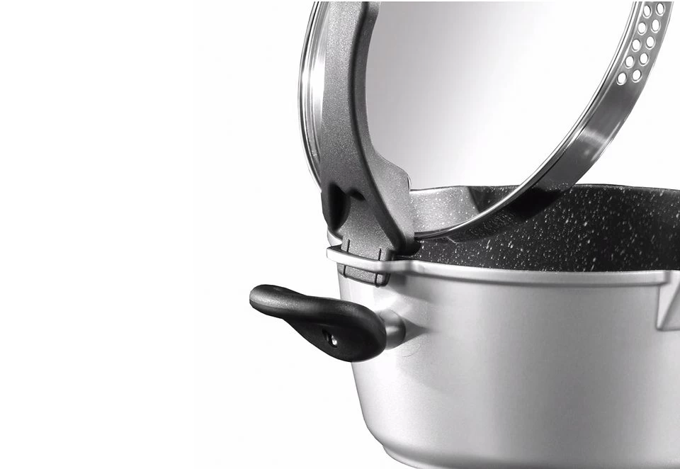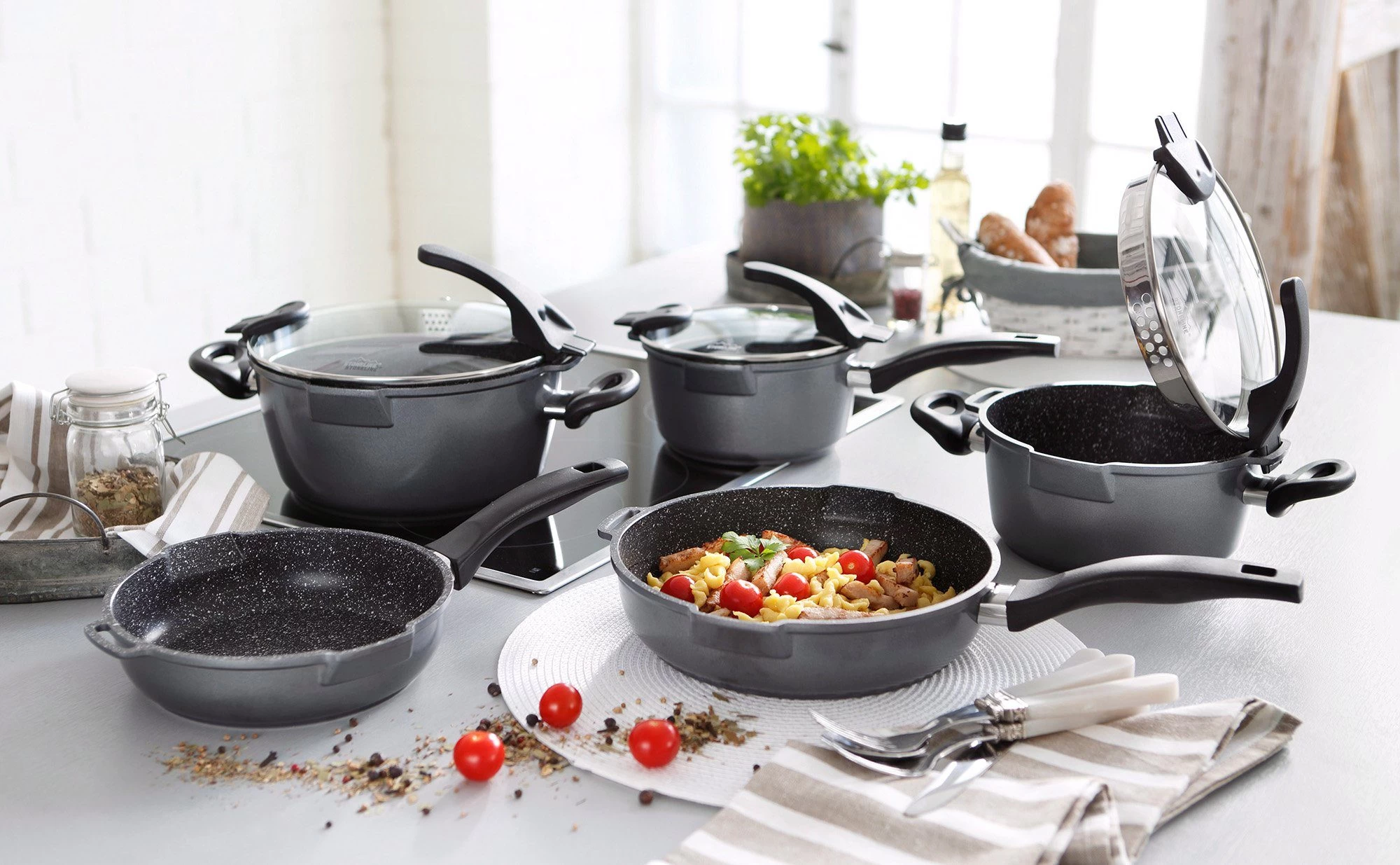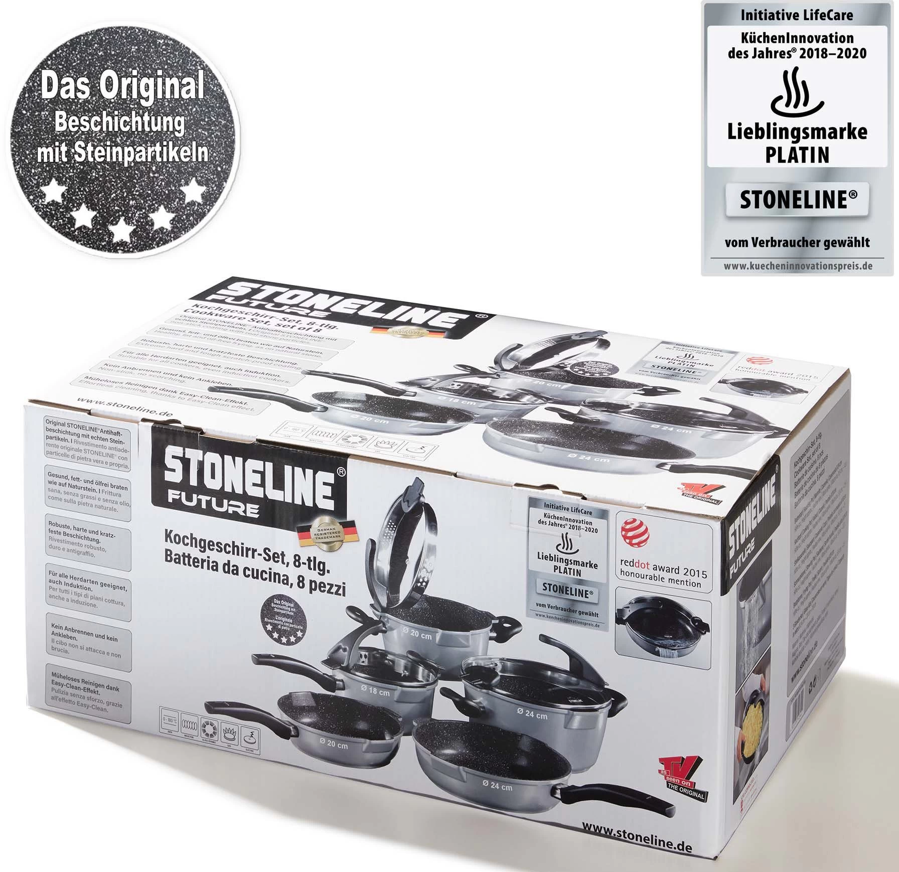 Pannenset, STONELINE® Future (8-delig). STONELINE® – het origineel met echte stenen deeltjes! Gezond en vetvrij koken, als op natuursteen. Van hoogwaardig gietaluminium, met absoluut krasvaste STONELINE-antiaanbaklaag. Aanbranden en aankoeken zijn verleden tijd, heel eenvoudig te reinigen. Extra dikke bodem, ovenbestendig tot 180 °C. Voor alle warmtebronnen, ook inductie. De 8-delige set bestaat uit 1 pan met glazen afgietdeksel Ø 20 en Ø 24 cm, 1 steelpan met glazen afgietdeksel Ø 18 cm, 1 hapjespan Ø 20 en Ø 24 cm.