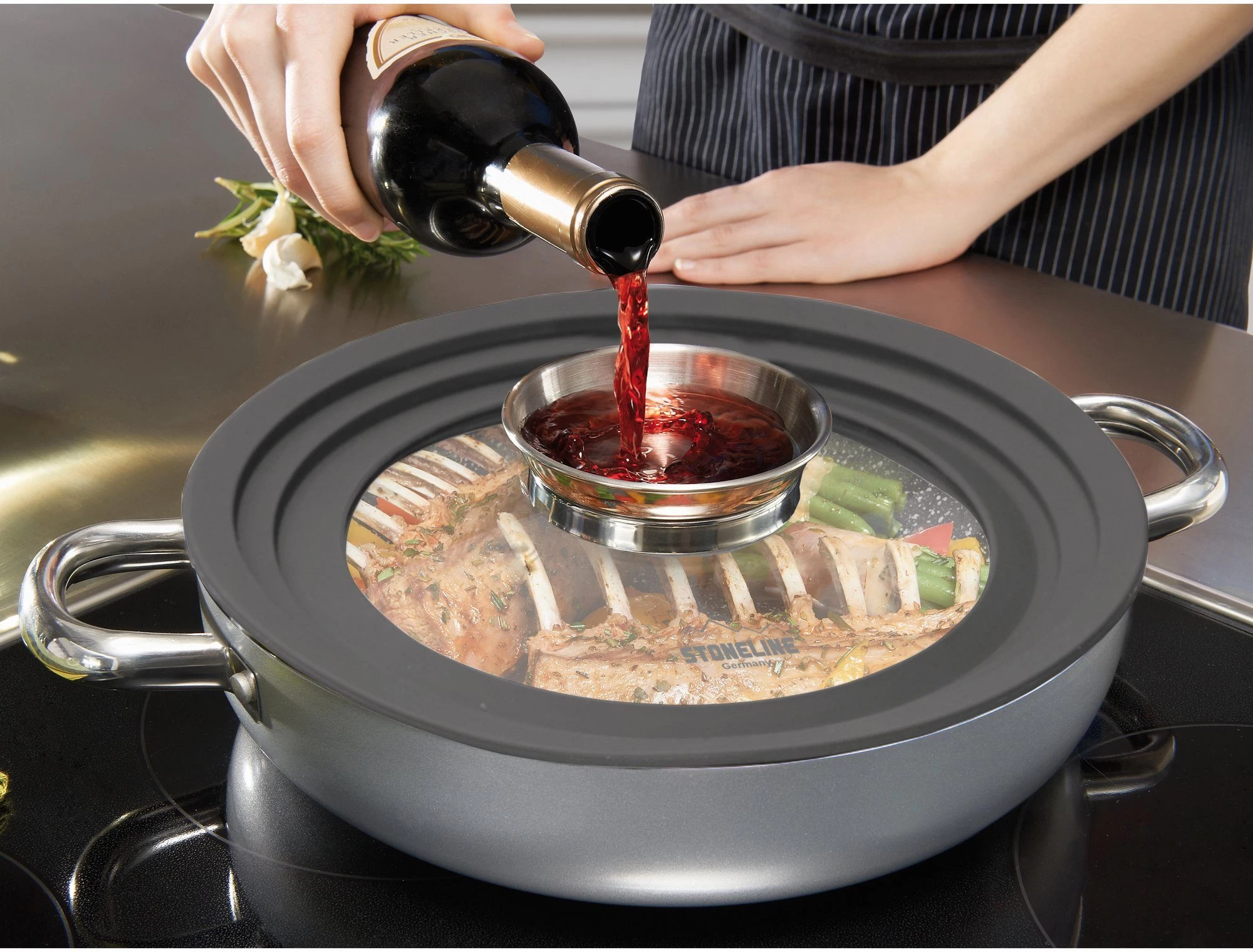 Ken je dat probleem: een hele lade vol met ontelbare glazen deksels en toch vind je niet de deksel die bij de (koeken)pan hoort. Dat is nu afgelopen! Dankzij de universele glasdeksel van STONELINE®! De universele glasdeksel van STONELINE® met siliconerand past op drie verschillende maten (koeken)pannen en beschikt over de unieke aroma-functie! De glazen aromadeksel maakt gedoseerde toediening van vloeistoffen zoals bijv. wijn, vloeibare specerijen of andere vloeistoffen via de dekselknop mogelijk. Zo krijgen je maaltijden een onmiskenbare smaak van toegevoegde aroma's.<br>De siliconerand beschermt het oppervlak van de pannenset en maakt de glazen deksel extra breukbestendig.<ul><li>1 glazen aromadeksel met siliconerand voor de afmetingen Ø 24/26/28 cm</li><li>1 deksel voor 3 maten: geschikt voor alle (koeken)pannen van Ø 24 tot 28 cm</li><li>Aroma-functie maakt gedoseerde toevoeging van vloeistoffen mogelijk</li><li>Kijkvenster van glas</li><li>Met stoomgaatje</li><li>Siliconerand beschermt de coating en maakt de deksel extra breukbestendig</li><li>Hittebestendig tot 180 °C</li><li>Materiaal: glas, edelstaal, silicone</li></ul>